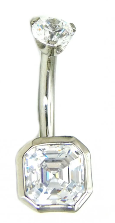 Um piercing sofisticado e delicado com zirconias Rosca: Interna  Material: Aço cirúrgico 316L Pedra: Zircônia Tamanho: 1.6mm espessura 10mm  comprimento Pedraria: 5 e 8mm